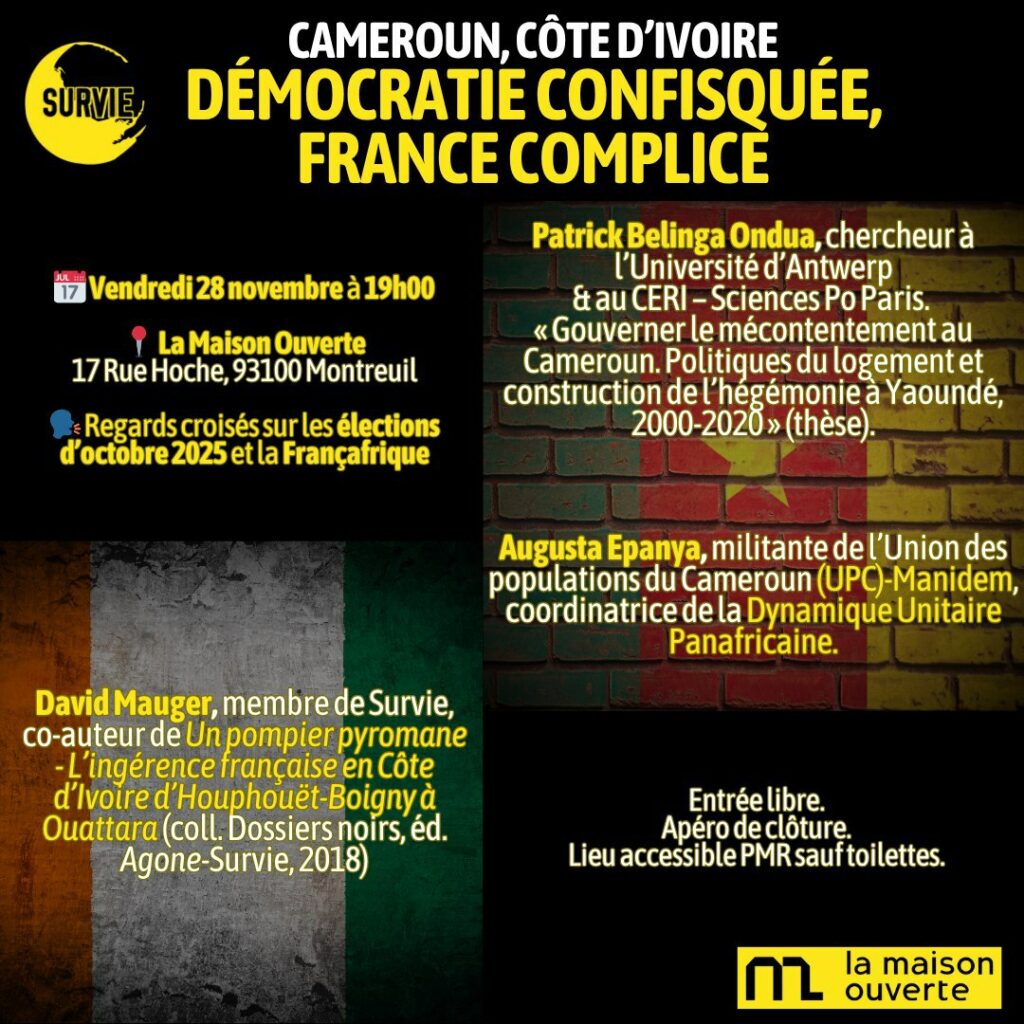 Le 28 novembre 2025 à La Maison Ouverte de Montreuil, l’association SURVIE, organisait une soirée intitulée : Regards croisés entre la Côte d’Ivoire et le Cameroun : Démocratie confisquée, la France complice. Dans cette première partie, nous nous arrêterons sur la situation au Cameroun, après les élections d’octobre 2025. Dans ce premier temps, nous entendrons successivement : Patrick Belinga Ondua, chercheur à l’Université d’Antwerp & au CERI – Sciences Po Paris. Il a soutenu sa thèse à l’Université de Genève, « Gouverner le mécontentement au Cameroun. Politiques du logement et construction de l’hégémonie à Yaoundé, 2000-2020 ».