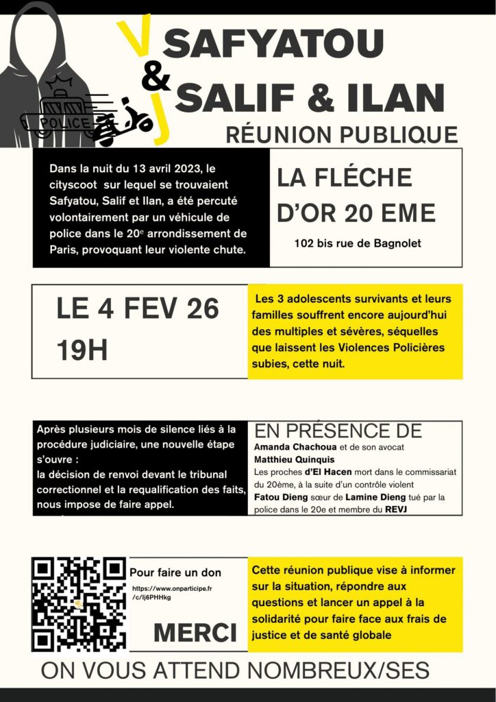 Aujourd’hui, nous vous diffusons l’enregistrement des prises de paroles de la réunion publique organisée le 04 février 2026 à la Fléche d’Or, dans l’affaire de violences policières concernant Safyatou, Salif et Ilan.